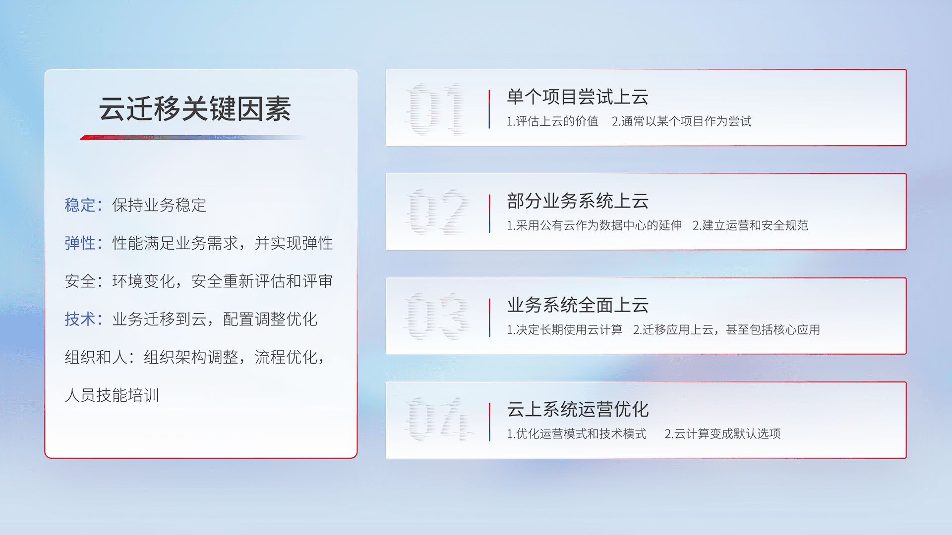 结合实际业务,,,,从规划设计、、云平台选型、、云原生改造、、、数据迁移、、集成交付,,,,迁移全过程为客户识别最佳上云路径,,做好风险识别管理,,设计网络架构、、、、身份权限、、、、安全审计合规、、、、操作审计、、、、日志审计、、、监控告警策略、、、多站点容灾设计等,,,,对云上基础设施进行整体规划,,提升IT治理水平,,,,以满足弹性、、、高可用、、高性能的需求。。。
