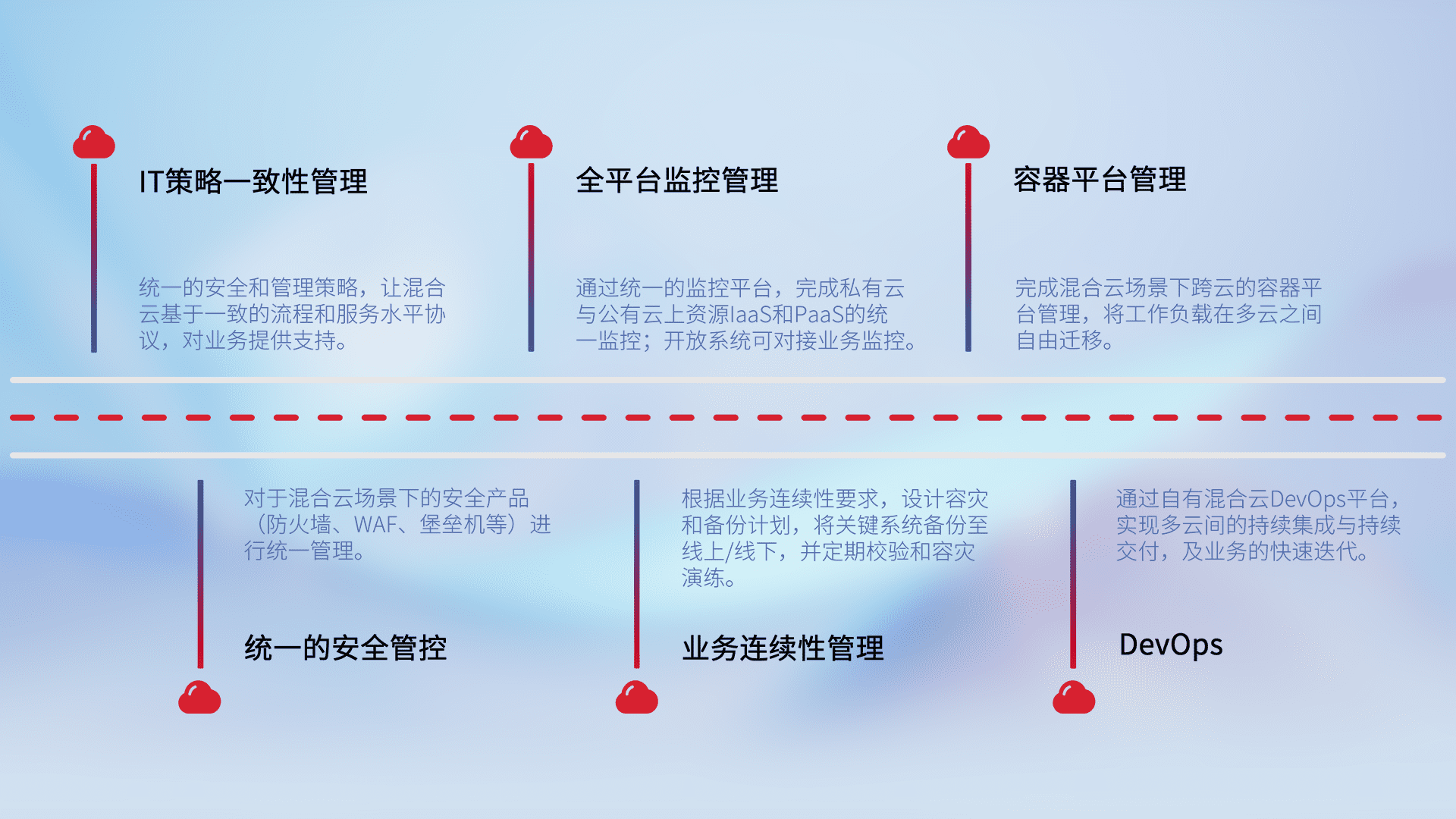 通过多云纳管,,以统一的资源数据模型把客户的云资源进行抽象和封装,,,进而实现对多云资源的统一操作,,,,保障云资源管理的可靠性、、稳定性与可用性。。量身定制化运维内容,,配置、、、开发运维、、补丁管理、、、、备份、、、、监控、、认证和访问管理、、、、审计和日常巡检等,,保障在用云过程中的可靠度,,,,稳定度以及高可用率。。。
