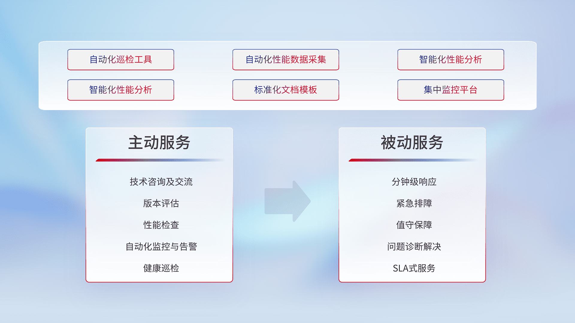 智能化工具和标准化文档,,保障服务质量,,,提供主动服务(包含技术咨询、、、版本评估、、、性能检查、、、自动化监控与告警、、健康巡检)和被动服务包含(分钟级响应、、、、紧急排障、、、值守保障、、、问题诊断解决、、、SLA服务)。。